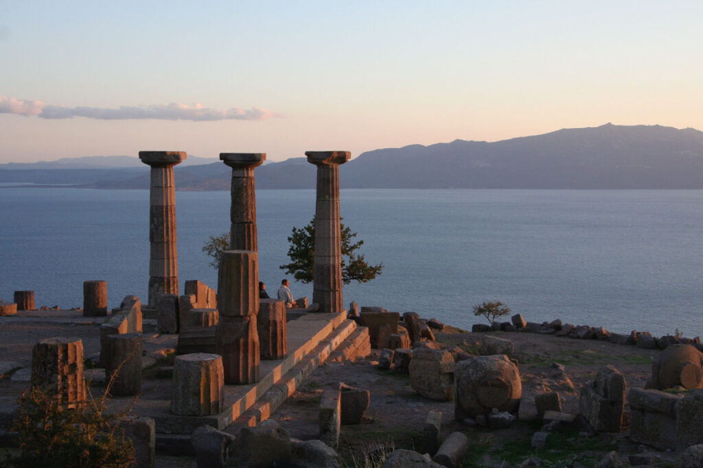 Antik kentin en yüksek noktasında Athena Tapınağı bulunuyor. Arkaik çağ’da Anadolu’da yapılan ilk ve tek dor düzenindeki tapınak, hala büyüleyici havasını koruyor. Zeus’un kızı ve 12 Olimpos Tanrısından biri olan Athena kentin koruyucu tanrıçasıymış. Sağlam sütunlardan çıkarılan örnek kalıplarla dökülen yeni sütunlar ayakta. Karşınızda Midilli adası, görkemli Ege denizi, yüzünüzü okşayan rüzgar, özellikle gün batımında sizi antik çağlara götürecek kadar etkileyici. Tapınağın kutsal odasında bulunan tanrıça heykeli 1800’lü yıllarda Amerikalılar tarafından götürülmüş.